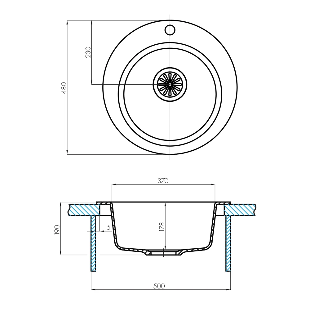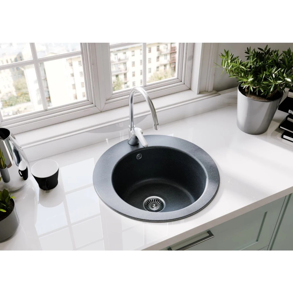 Классическая кухонная мойка из литого мрамора круглой формы, Покрытие Gelcoat обеспечивает высокую устойчивость к механическим воздействиям, которым подвергается поверхность мойки в процессе эксплуатации.