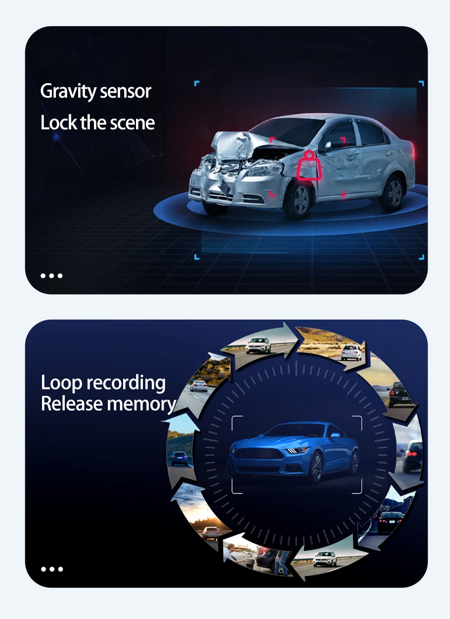 Footage is stored in loops of 1/3 minute segments according to your setting. Seamless Loop Recording overwrites the oldest footage with the newest upon filling a card to capacity. G-Sensor will lock footage in the event of an accident, the locked fragments will not be overwritten.