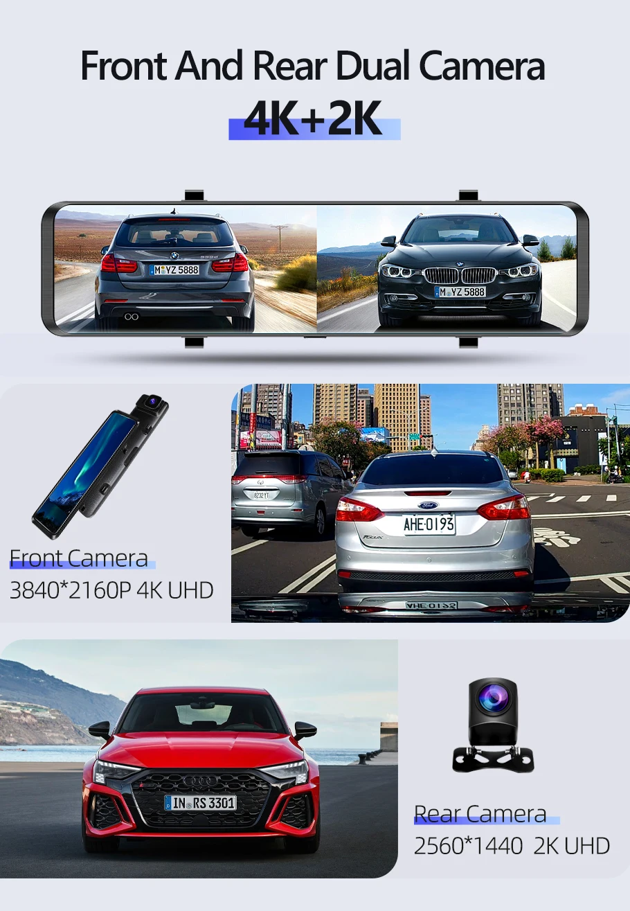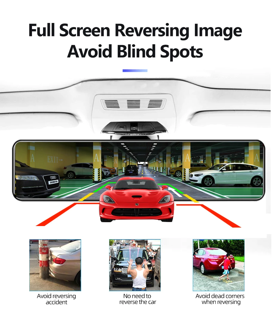 When the car is reversing, the device automatically switches to the rear camera image view through the 12-inch full-mirror screen, without manual operation. It comes with high-quality images, full-screen reversing images to avoid blind spots, and to avoid blind spots when reversing.(Need to connect the red wire in the rear camera to the positive pole of the power supply)