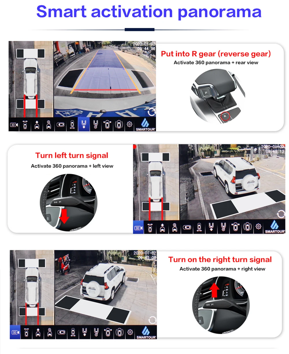 Когда автомобиль задним ходом, поверните влево или вправо, 360 система триггера сигналом лампы, автомобильный экран автоматически переключается на задний, левый, правый вид, затем показывает передний вид после запуска. С функцией мониторинга парковки и видеорегистратором