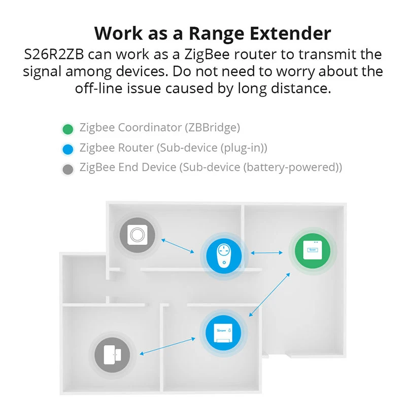 * Работает как расширитель диапазона-S26R2ZB может работать как маршрутизатор ZigBee для передачи сигнала между устройствами. Не нужно беспокоиться о проблеме, вызванной длительным расстоянием.