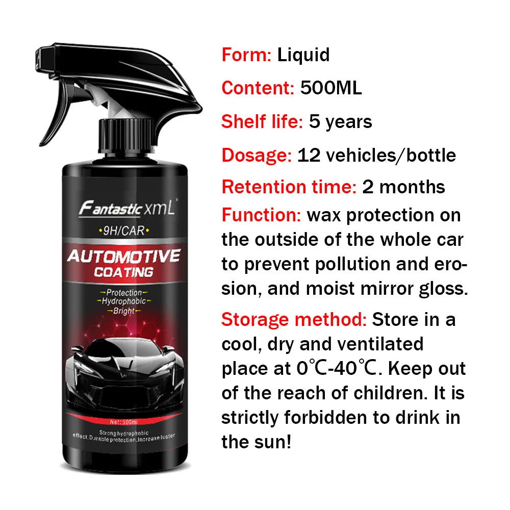Название продукта: нанопокрытие агент емкость продукта: 500 мл Метод хранения: помещается в прохладном сухом месте Особенности: 1. Большая емкость, одна бутылка может использоваться 12 раз, универсальна для всего внешнего вида автомобиля, всех видов автомобильной краски. 2. Вода в форме листьев лотоса, не загрязняет и легко моется: пыль, грязь и другие пятна легко прилипают к поверхности краски, чтобы сделать поверхность краски грязной, с эффектом листьев лотоса после нанесения покрытия, улучшите чистку поверхности краски и гидрофобность 3. Повышает твердость и уменьшает царапины: Песчаная эрозия вызывает различные царапины на поверхности краски, образуя защитный слой после покрытия, уменьшая или избегая царапин, вызванных внешними силами и уменьшая степень повреждения краски. 4. Высокая термостойкость, отсутствие следов горения: после воздействия солнечного света и ультрафиолетового излучения, это вызовет окислительное выцветание краски. После использования этого распыленного вручную воска он может эффективно противостоять окислительному обесцвечиванию, вызванному высокой температурой, и сделать краску ярче. 5. Формируя слой покрытия, яркий, как новый: с использованием автомобиля, различные вещества в воздухе медленно реагируют с автомобильной краской для коррозии краски автомобиля, так что поверхность краски медленно тускнеет, и после покрытия, Слой покрытия формируется для восстановления краски в заводском состоянии. 6. Конструкция уплотнения: герметичная с бумагой из оловянной фольги, чтобы предотвратить нестабильность дорожной поверхности и протекание во время транспортировки. 7. Вращающееся сопло: поверните, чтобы выключить или включить, чтобы избежать утечки, когда не используется, во избежание ненужных отходов! 8. Простота в эксплуатации: один посыпать и один протирать, Легкое покрытие Упаковочный лист
