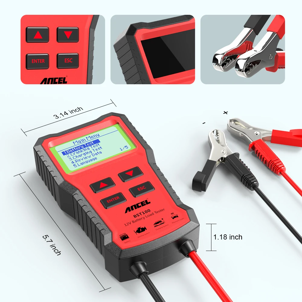 Ancel BST100 тестер батареи используется для запуска свинцово-кислотной батареи, а также проверки следующих условий батареи, запуска, зарядки и загрузки. Благодаря отличному дизайну, простоте в эксплуатации, точному чтению, полным функциям, этот тестер обеспечивает показания большим ЖК-дисплеем и подсказки на звук и светильник при тестировании
