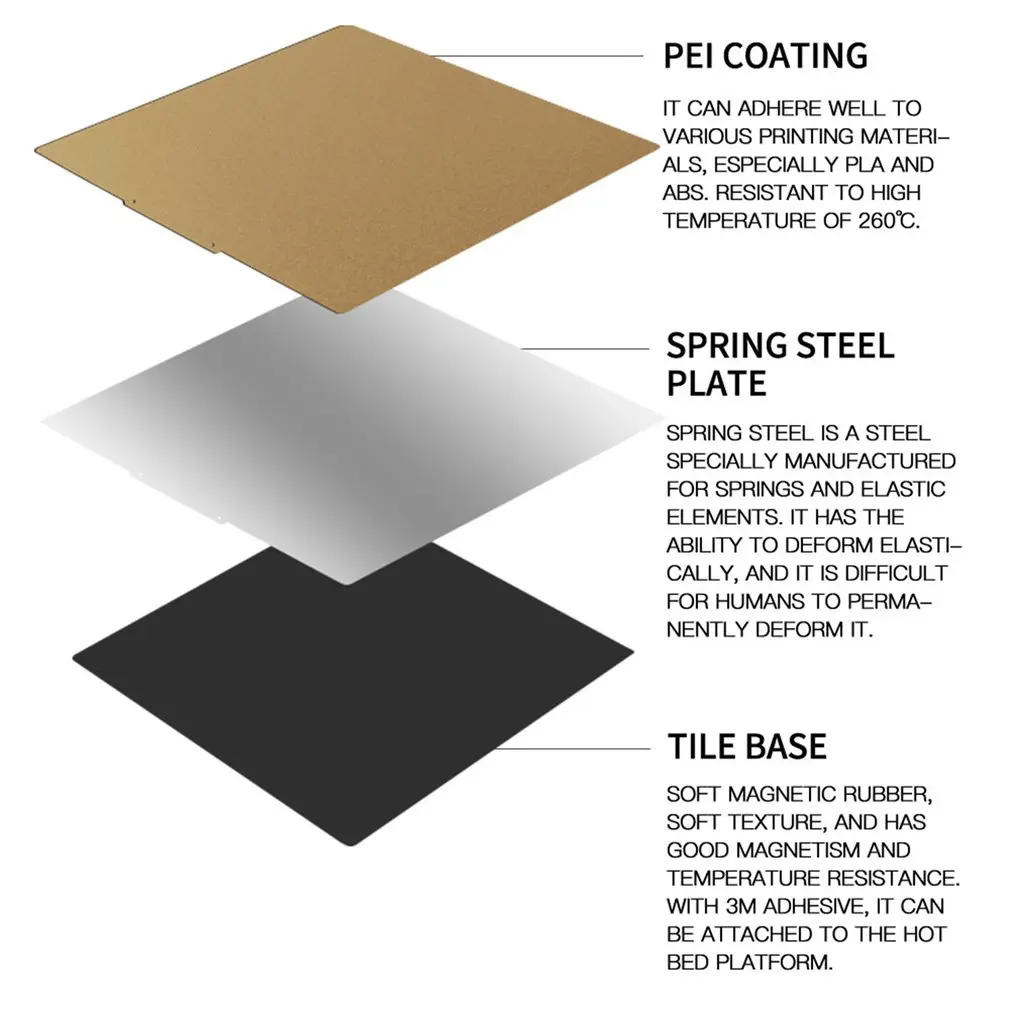 1.PEI coating :it can adhere well to various printing materials, especially PLA and ABS. resistant to high temperature of 260c.