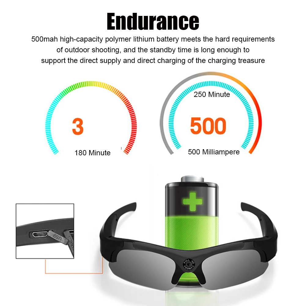 * 5. Очки для камеры поддерживают зарядку через USB. Это время зарядки составляет около 60 минут, поэтому вы можете использовать внешний аккумулятор для зарядки, очень удобно. Вы можете воспроизводить записи на планшете, подключив их к компьютеру или телевизору через прилагаемый usb-кабель.