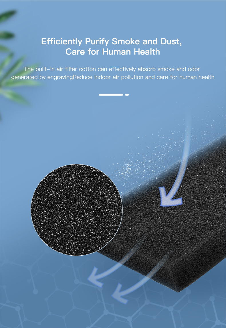Встроенный воздушный фильтр из хлопка может эффективно поглощать дым и запах, создаваемый гравировкой, уменьшает загрязнение воздуха в помещении и заботится о здоровье человека.Отличное место с длительным сроком службы