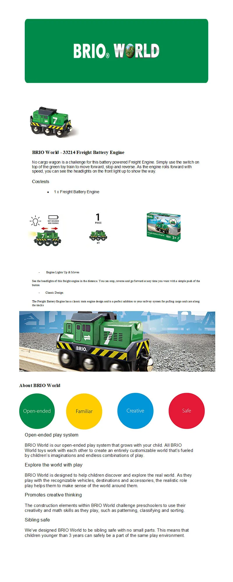Совместимость-по мере развития вашего ребенка, так что их железная дорога может играть, так как 33214 грузовой двигатель батареи совместим со всеми другими Брио железнодорожными игрушками.