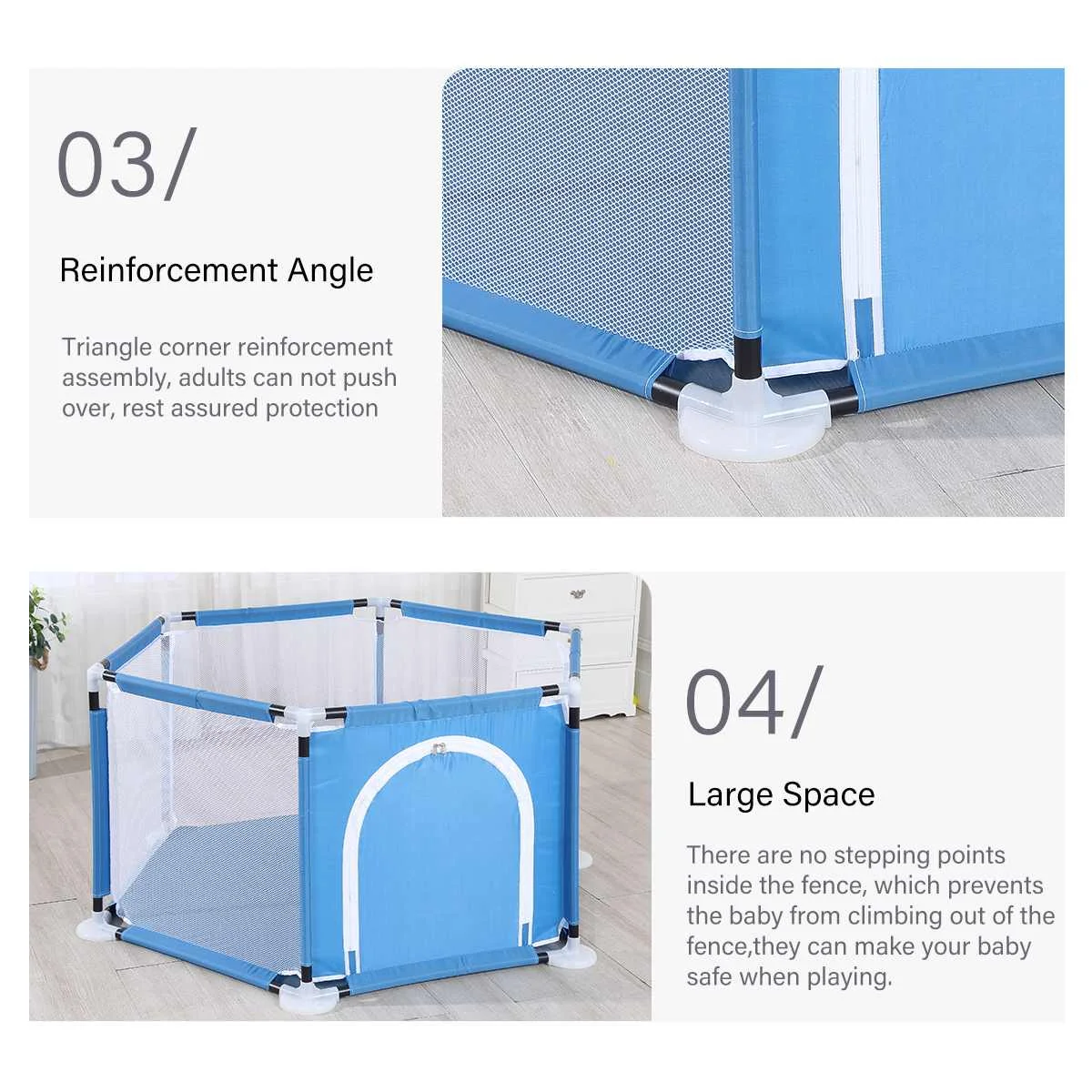 ● Стабильное и большое пространство: внутри забора нет шаговых точек, которые не дают малышу выйти из забора, они могут обеспечить безопасность вашего ребенка во время игры. Достаточно места для игры для вашего ребенка.