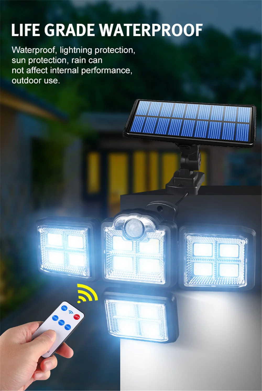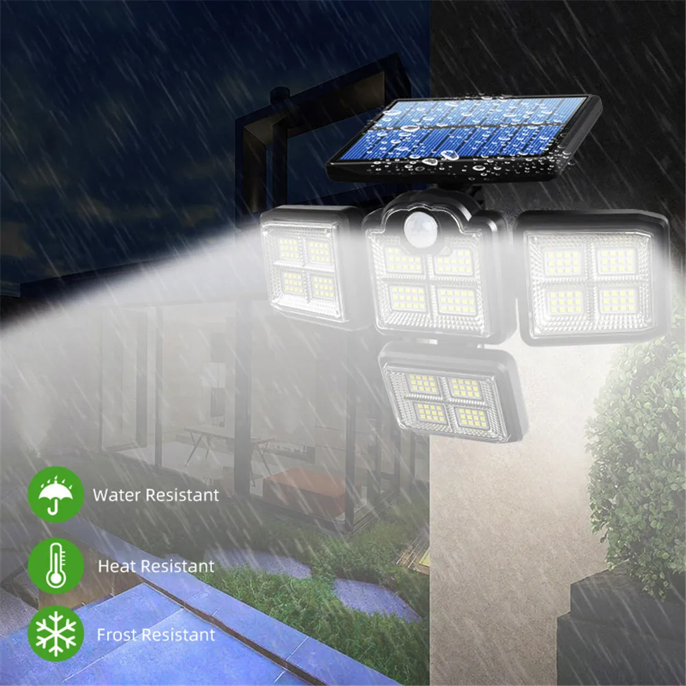 Наружные солнечные огни с 4 головками имеют Мульти-совместный вращающийся дизайн, который может обеспечить более широкое освещение. И наружные огни датчика движения поставляются с пультом дистанционного управления, чтобы вы могли переключить три режима освещения или включить/выключить в течение 7 м.