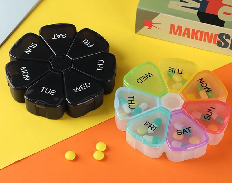 Яркие цвета: Внешний чехол изготовлен из прозрачного материала, и каждый лоток имеет уникальный яркий цвет, который позволяет пользователю легко различать дни недели.