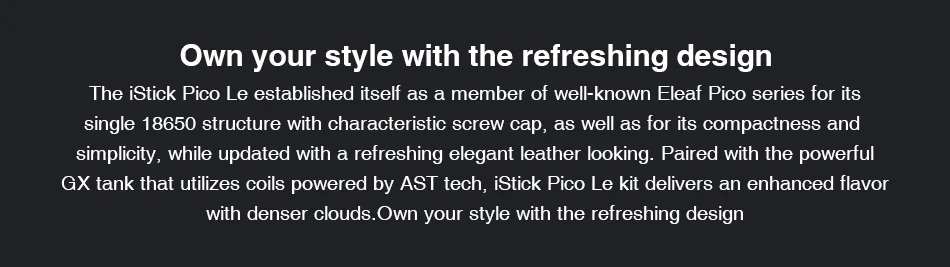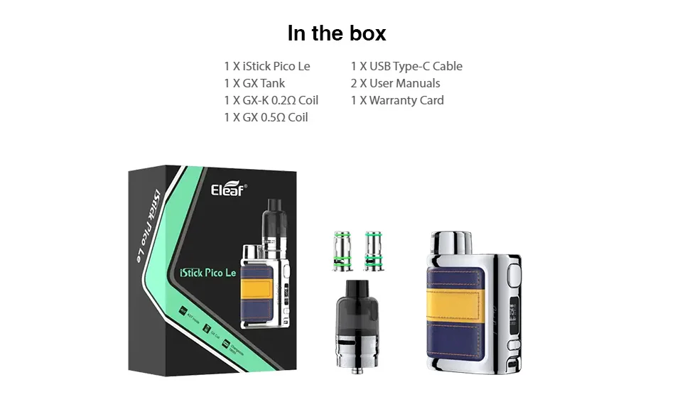 Eleaf iStick Pico Le Kit-это одно из новейших и самых больших устройств, которое позволяет работать и работать безупречно. Сращенная кожа и яркий контраст цвета всегда бьют ваше сердце, вы сразу будете чувствовать себя тепло и нравится, каждый в различных цветах, чтобы гарантировать, что есть предложение для всех. Существует множество функций, напичканных в это замечательное устройство, прежде всего, GX pod поставляется с 5 мл емкость vape сока и использует свои GX катушки, рожденные для облаков, и работает для премиум. В соответствии с технологией AST внутри катушки и возможностью тонкой настройки воздушного потока, который приносит вам точное управление воздушным потоком и супер облако, погоня за длительным использованием и желаемый результат для послевкусия.
