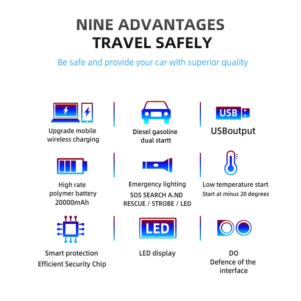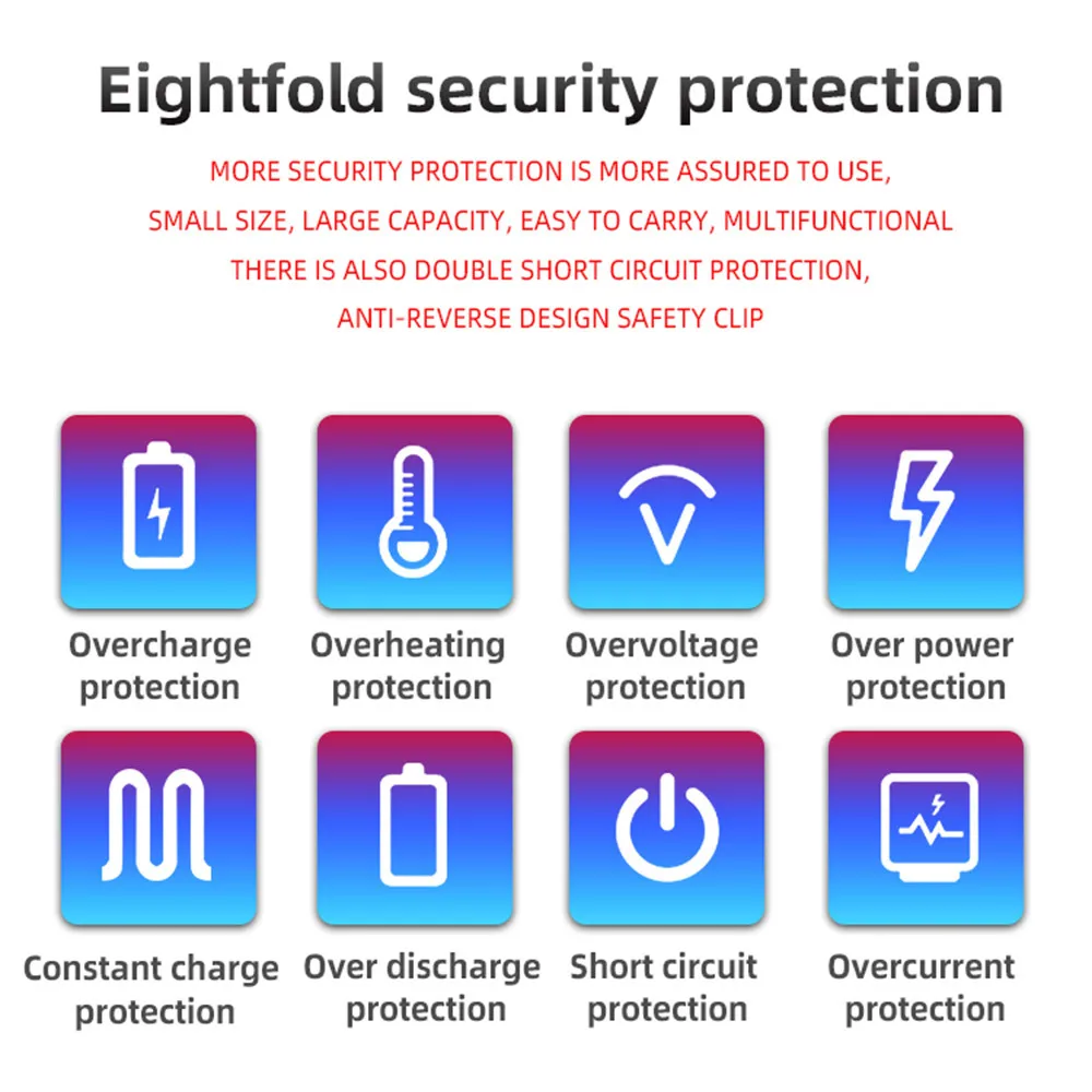 -Небольшой размер, высокая емкость, легко носить с собой, универсальный, и есть двойная защита от короткого замыкания и анти-обратный дизайн, безопасные зажимы.