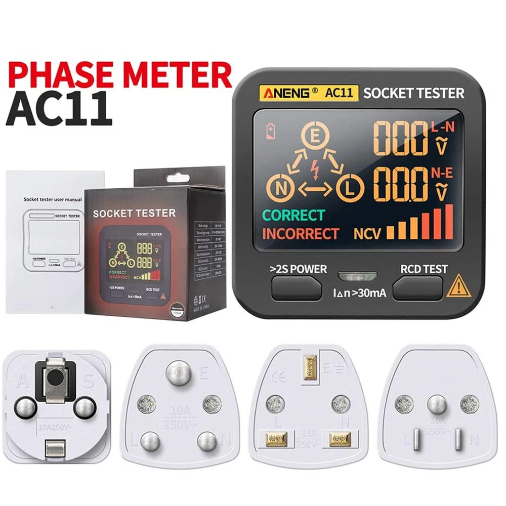 ANENG AC11 умный тестер сокетов в основном используется для обнаружения поляризации силовых сокеров и безопасности выключателя утечки. Он может быстро и точно обнаруживать проводку розетки. Одновременно, он может проверить напряжение розетки и показать на ЖК-дисплее светодиодный экран.