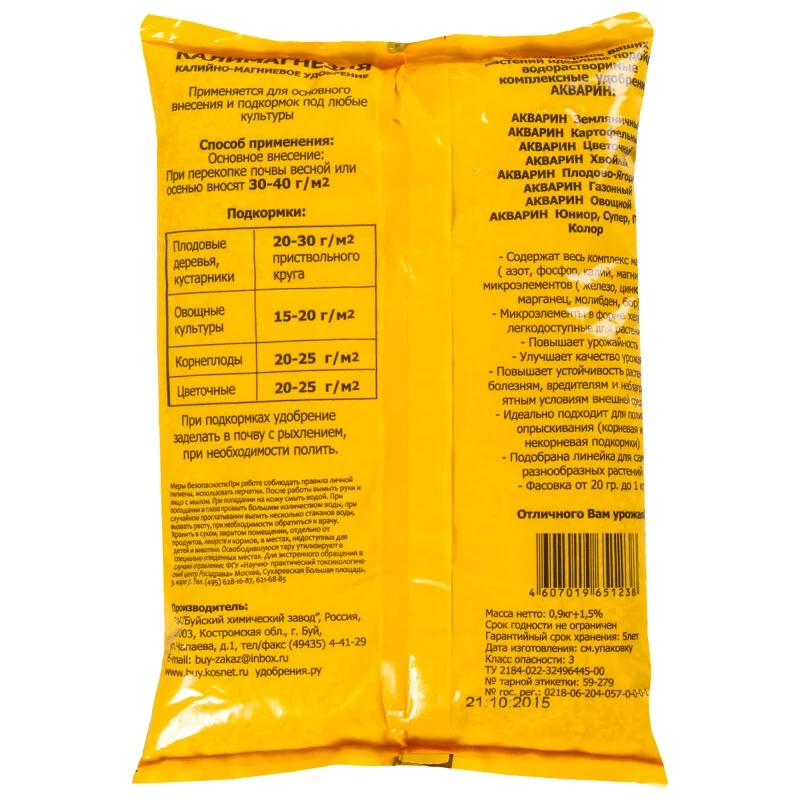 «Калимагнезия» — это универсальное калийно-магниевое удобрение. Отличается низким содержанием хлора и применимо ко всем типам почв. Может предназначаться для основного внесения, а также в виде подкормок. Расход удобрения зависит от способа использования: перекопка открытого грунта — 30-40 г/м2, в теплицах и парниках — 40-45 г/м2. Подкормка непосредственно под растение требует внесения 15-30 г/м2 сухого порошка. Применение средства рекомендуется с апреля по октябрь. Удобрение имеет неограниченный срок годности. Преимущества: универсальность применения; высокое качество; демократичная цена.