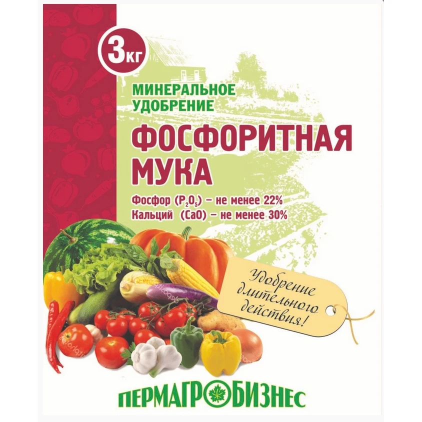 Основные агрохимические свойства муки фосфоритной:• эффективное минеральное удобрение, которое кроме основного элемента питания фосфора (Р2О5 не менее 17%), содержит кальций (до 33%), серу, магний, кремний и широкий спектр микроэлементов: Fе, Сu, В, Мп, Мо, Zn, Со, причем содержание микроэлементов в фосфоритной муке адекватно их среднему нормальному уровню концентраций в почвах. В фосфоритной муке содержится более 11 элементов, необходимых для питания растений;• способствует повышению урожайности всех сельскохозяйственных культур, устойчивости культур к различным заболеваниям, засухе, морозу, благоприятно влияет на качество сельскохозяйственной продукции;• стимулирует развитие корневой системы растений, которая сильнее ветвится и глубже проникает в почву, что в свою очередь способствует улучшению снабжения растений питательными элементами и влагой;• при внесении в почву ослабляет вредную для растений и микроорганизмов кислотность почвы;• улучшает физико-химические свойства почвы, увеличивает её биологическую активность, улучшает структуру почвы, делает её влаго- и воздухопроницаемой, способствует повышению плодородия почвы;• внесение с физиологически кислыми азотными удобрениями увеличивает коэффициент их использования на 15-20%, в результате чего снижается их норма внесения;• не загрязняет токсичными компонентами почвенные воды и водоемы, не оказывает негативного влияния на почвенную среду и растения с экологических позиций даже при использовании сверхвысоких доз;• не вымывается из почвы в течение 5-7 лет и более.Фасовка: 3 кг