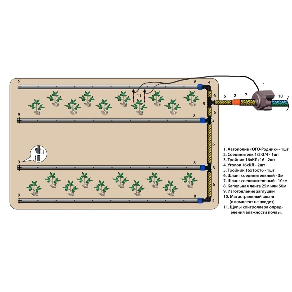 Комплект "АКП ОГО-Родник" идеально подойдет для создания системы капельного автоматизированного полива в теплицах и оранжереях, подключенного к баку или бочке, установленных на 1-2 м выше уровня полива.