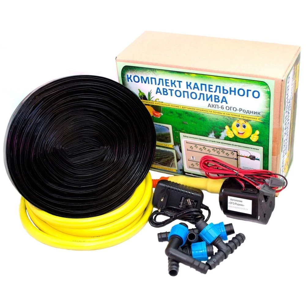 Комплект автополива "АКП-6 ОГО-Родник-1" состоит из электрического крана со встроенной системой управления, датчика влажности почвы и блока питания от сети 220В, комплекта капельного полива со всей необходимой фурнитурой рассчитанного на площадь 3х4 – 3х6м. Датчик влажности производит постоянный контроль за влажностью почвы, если в почве станет недостаточно влаги для растения – кран откроется и начнется полив. Система автополив “ОГО-Родник” польет растения, когда это будет нужно.