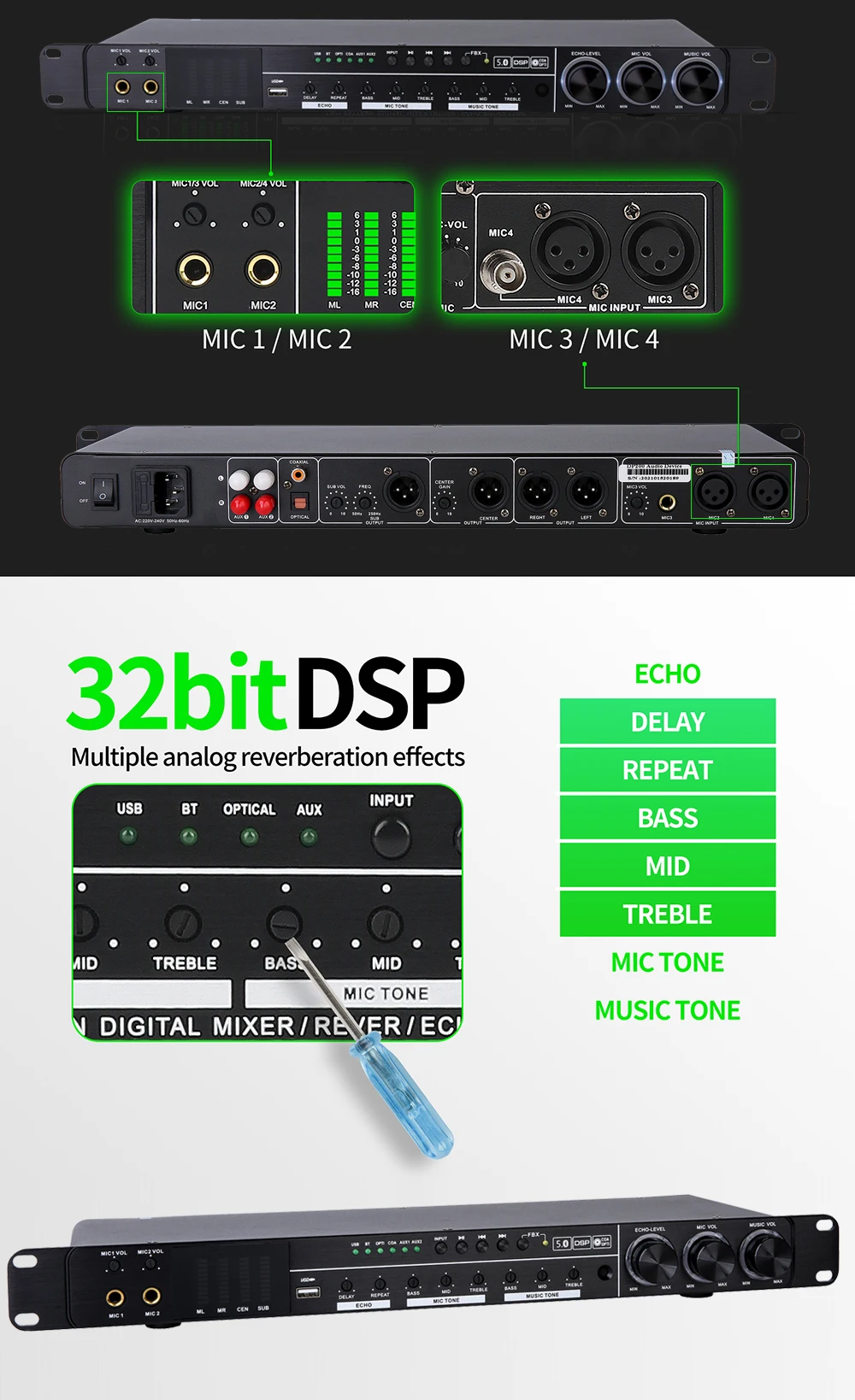 3. Независимая Регулировка-многомодовая Регулировка реверберации, регулировка микрофона и регулировка музыки