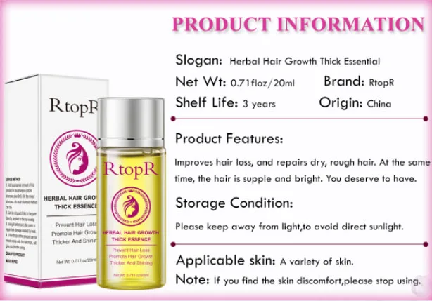 Слоган: Предотвращает выпадение волос Стимулирует рост волос Толстый и сияющий Эффекты: Богатое разнообразными растительными цветами эссенцией масло, способствует росту волос, углубляет волосяные фолликулы, улучшает выпадение волос и восстанавливает сухие, грубые проблемы с волосами. Сделайте ваши волосы мягкими, густыми, черными и яркими, излучающими приятные цветы. Вы заслуживаете иметь это и красивое состояние волос.