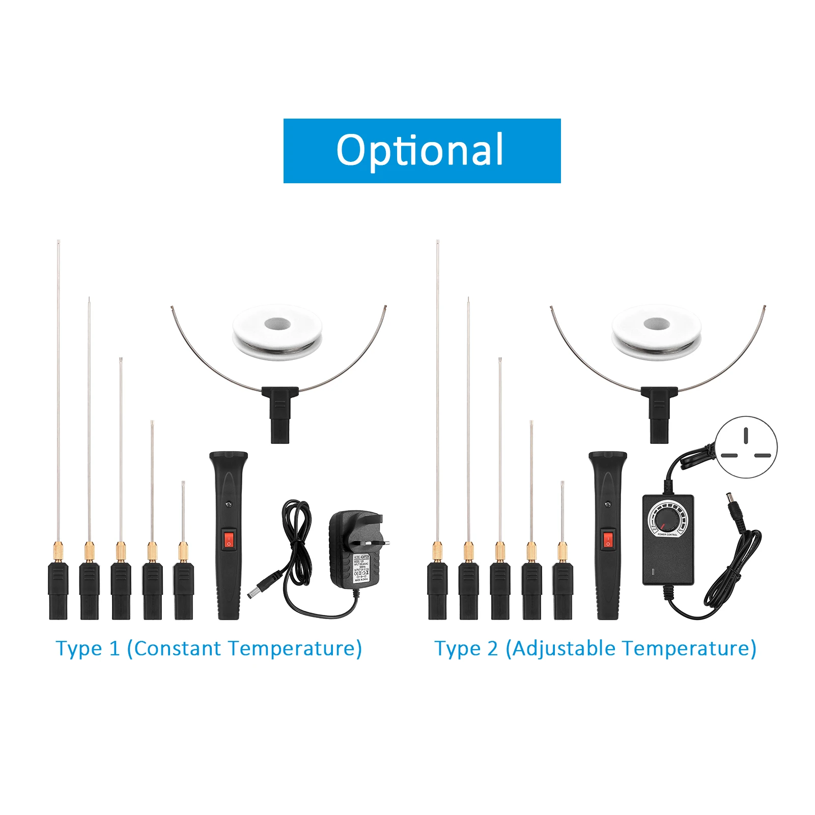 В комплект входит основная ручка, 5 наконечников разной длины, наконечник арки, катушка нагревательного провода и адаптер питания (постоянная температура или регулируемая температура для опции), удовлетворяющий различные потребности.