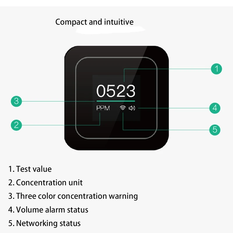 1. С тремя различными цветными индикаторами концентрации CO2 (можно установить в приложении): Зеленый означает менее 800ppm, желтый означает 800 ~ 1500ppm и красный означает более чем 1500ppm.