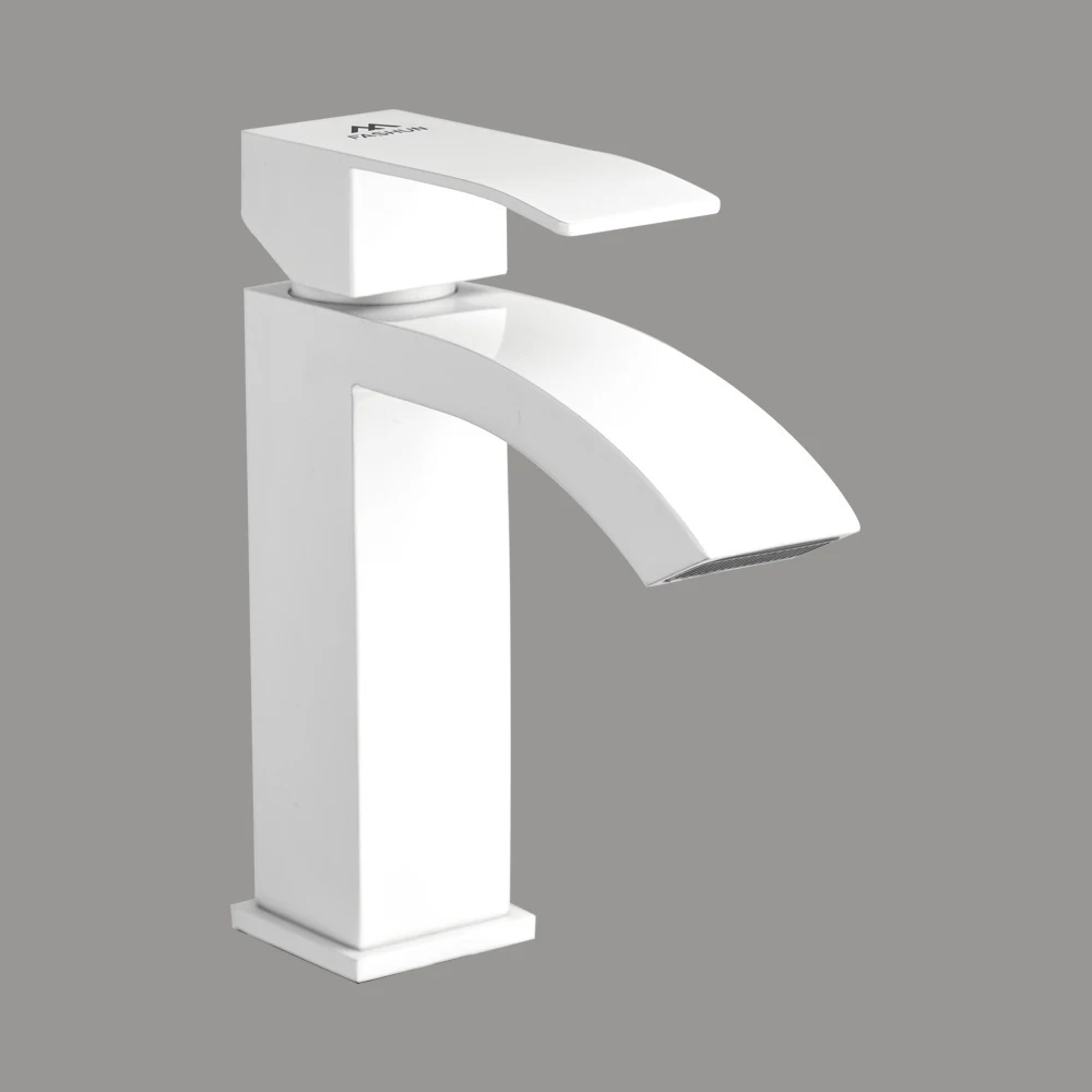 Смеситель не высокий и короткий для умывальника стальной, белого цвета с керамическим картриджем в строгом дизайне.