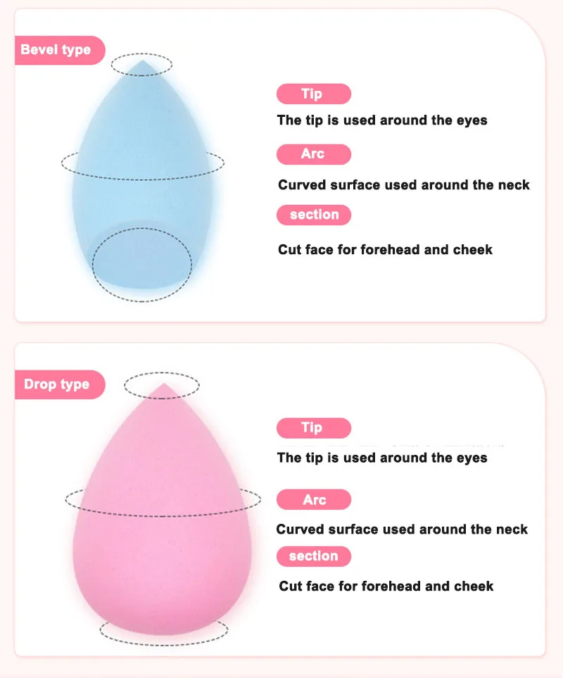2. С идеальной формой, эти губки вписываются в контуры всех областей лица, для еще безупречного, гладкого и улучшенного нанесения без каких-либо линий, как кисти. Округлые стороны смешивают большие области лица с повторным протиранием или заострением, острый конец хорошо подходит для растушевки под глазами и других узких областей пятен и дефектов.