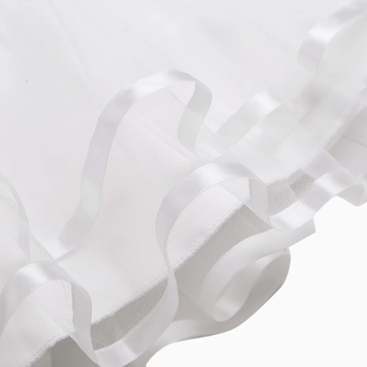4 слоя платья, 2 слоя сетки с лентой по подолу, 1 слой атласа и 1 подкладка с сеткой для дополнительной полноты. Подходящие хлопковые блумеры с эластичным поясом и отверстиями для ног.