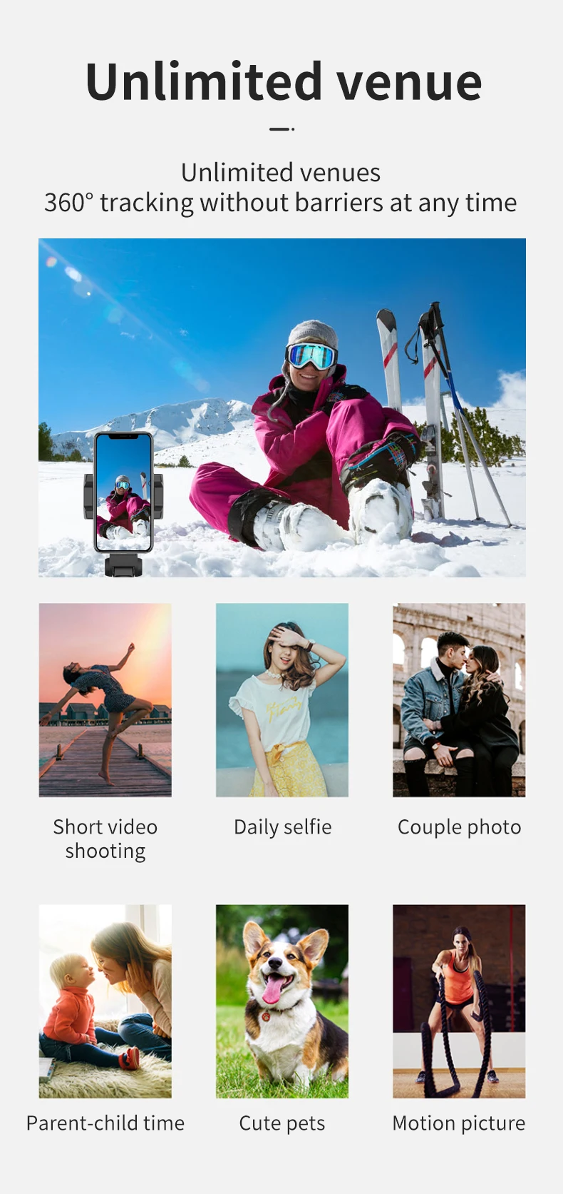 Простое в использовании приложение и модернизированное устройство: не только человеческое лицо, но и другие объекты могут быть признаны как цель отслеживания, включает умные фотографии/видео и автоматический обратный отсчет, не нужно загружать приложение, прост в использовании.