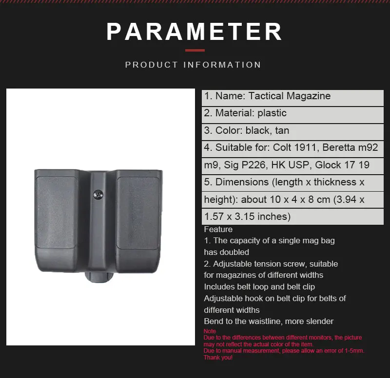 Тактический чехол с двойным журналом для 9 мм, 0.40cal Универсальный чехол с пистолетом для Beretta , Sig P226, H & K USP ,Glock 17 19 Black Tan
