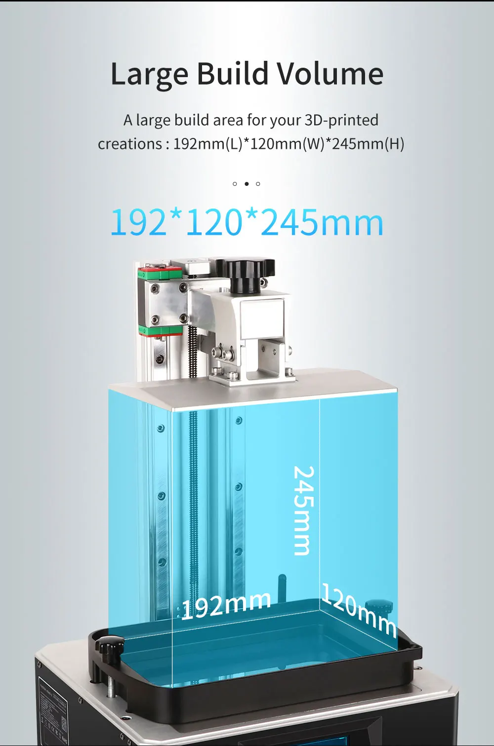Время выдержки составляет всего 1,5-2 секунды, а максимальная скорость печати 60 мм/час, делая скорость печати 3X быстрее, чем Фотон.