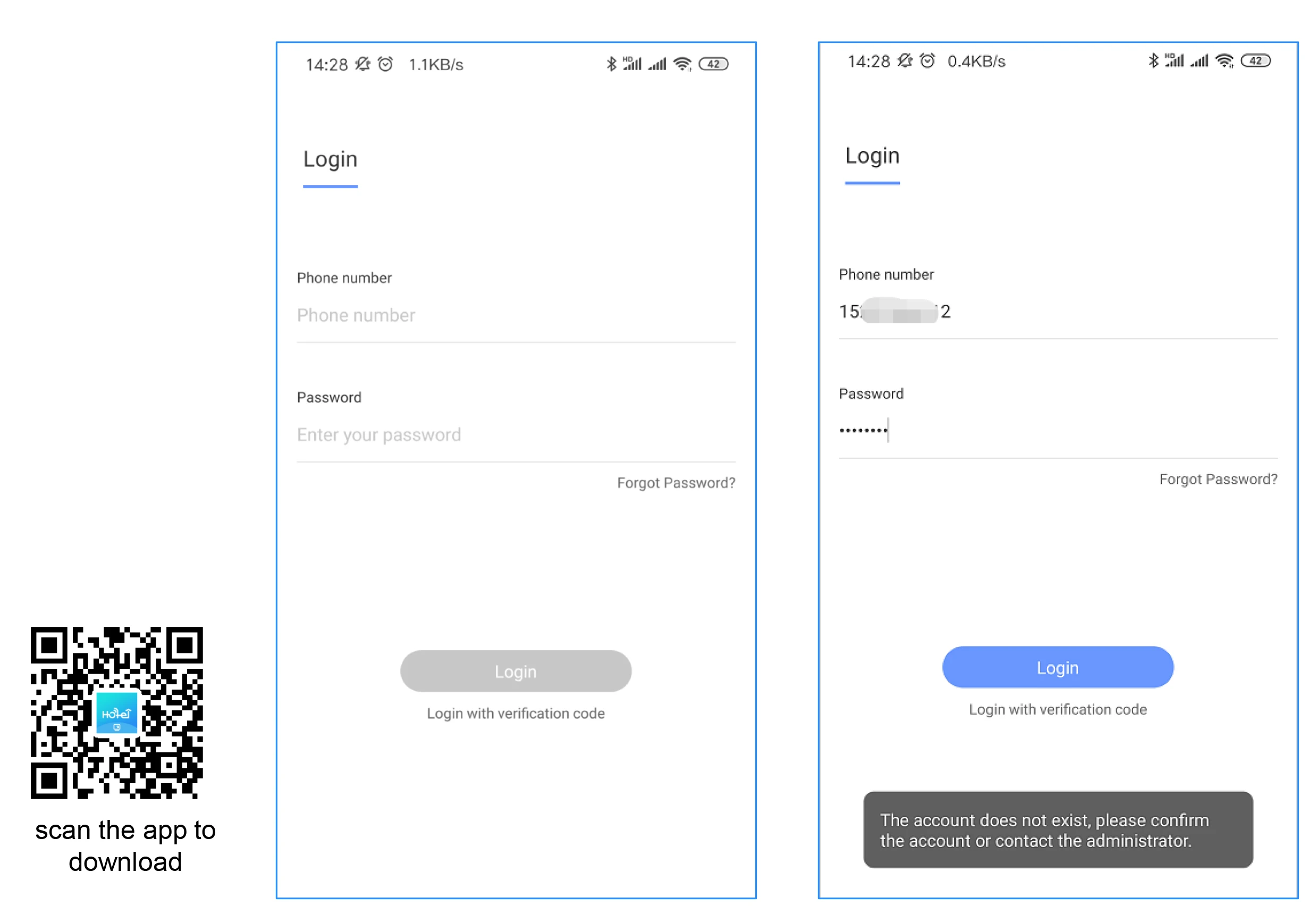 Сотрудники (предоставленные права входа в приложение) могут войти в систему, используя свой мобильный телефон и пароль