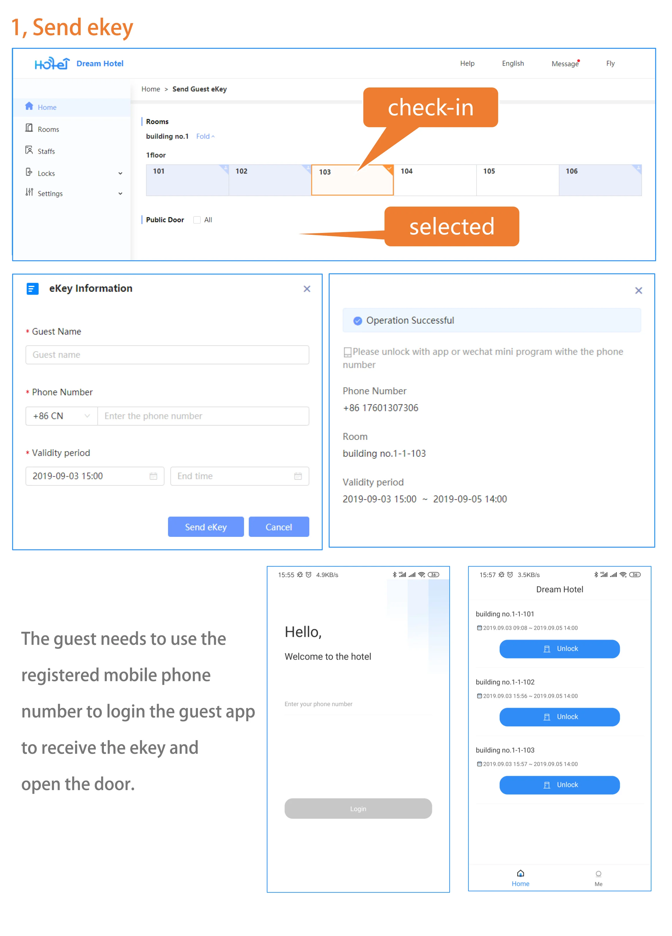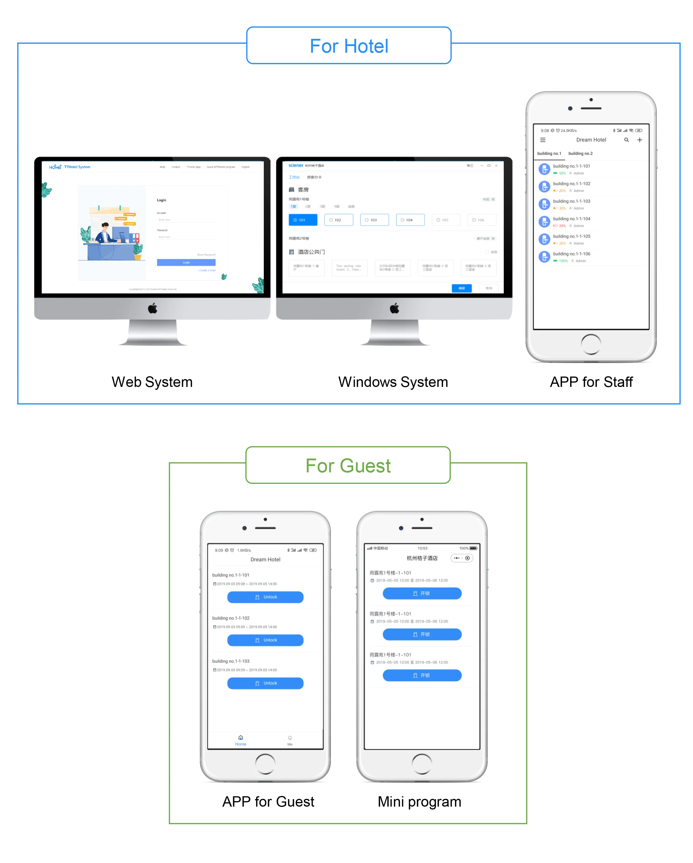 Система thotel включает настольное программное обеспечение Windows, которое используется для выпуска карты, гостиничное приложение, которое используется для управления устройствами, гость приложение, которое используется для разблокировки с телефоном.