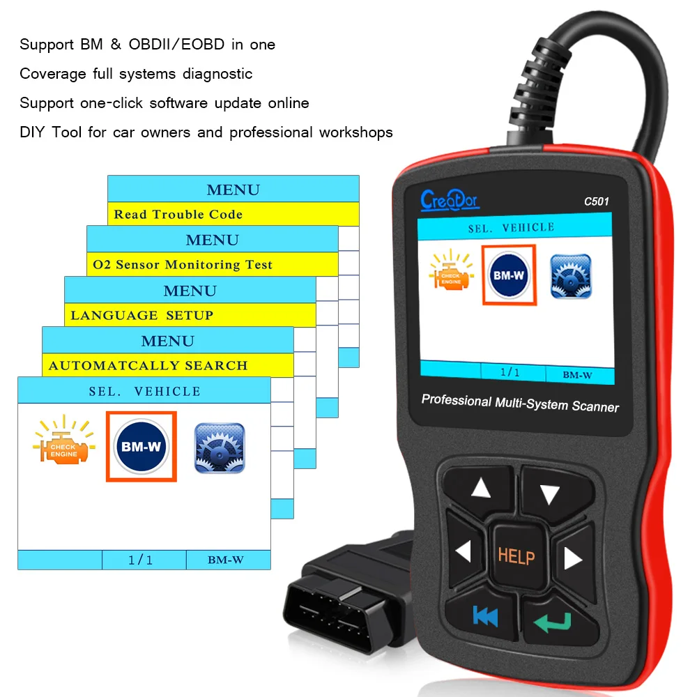 Creator C501 для BMWs Full System Scan Tool. Creator C501-это новые популярные сканеры кодов OBDII, в основном сфокусированные на автомобильной диагностической индустрии, помогающие DIY-пользователям и профессиональным техникам устранить проблемы с двигателем автомобиля и ошибки, связанные с выбросами. С новым запатентованным дизайном и настоящим цветным широким экраном, C501 может легко и быстро получить доступ к автомобильной компьютерной системе (ECU), диагностировать проблемы с двигателем и стереть их одним щелчком. C501 будет лучшим решением для домашних пользователей и профессиональных техников, сохранит ваше время и деньги на станцию обслуживания!