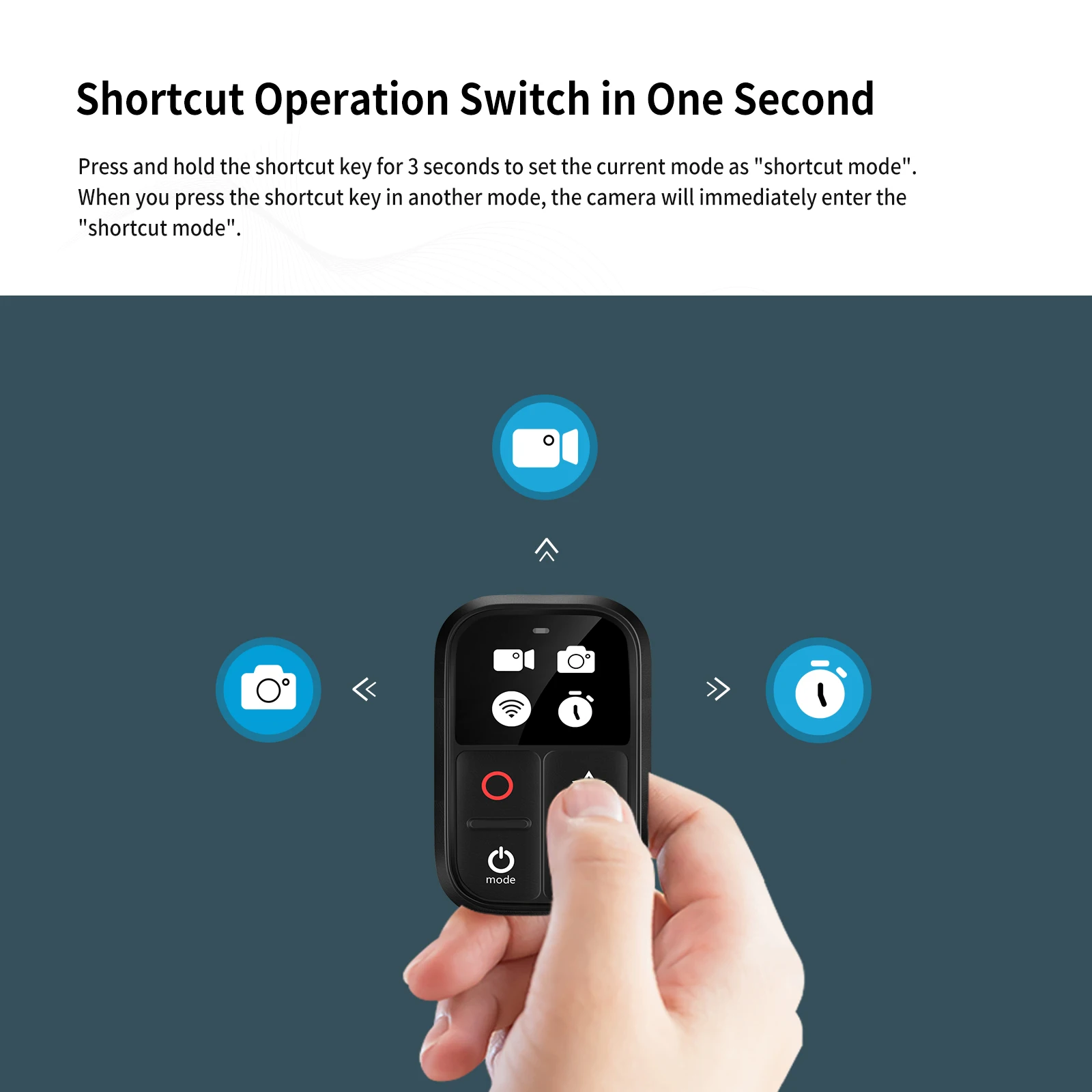 10. Keyboard shortcut design:When you are in ''Video'', ''Photo'', ''Continuous Shooting'', ''Time Lapse'', ''Playback'', ''Setting'' mode, press and hold the shortcut key for 3 seconds to set the current mode to ''Quick Mode''.When you press the shortcut button, the camera will immediately enter the corresponding ''shortcut mode''.