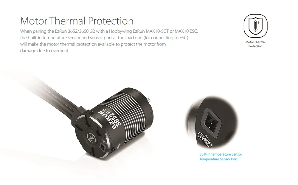 • Built-in temperature sensor and sensor port protect the motor from damage due to overheat when pairing EZRUN 3652/3660 G2 with a EZRUN MAX10/MAX10 SCT ESC.