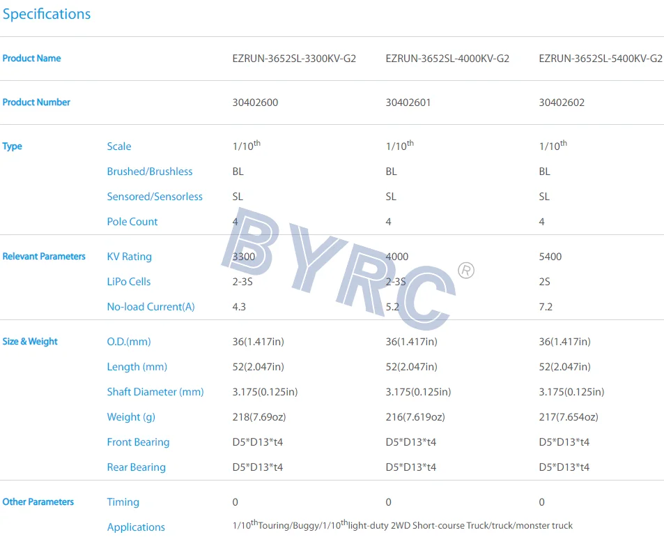 • Excellent match between EZRUN 3652/3660 G2 with EZRUN MAX10/MAX10 SCT guarantees users large torque plus a very smooth and linear power band.
