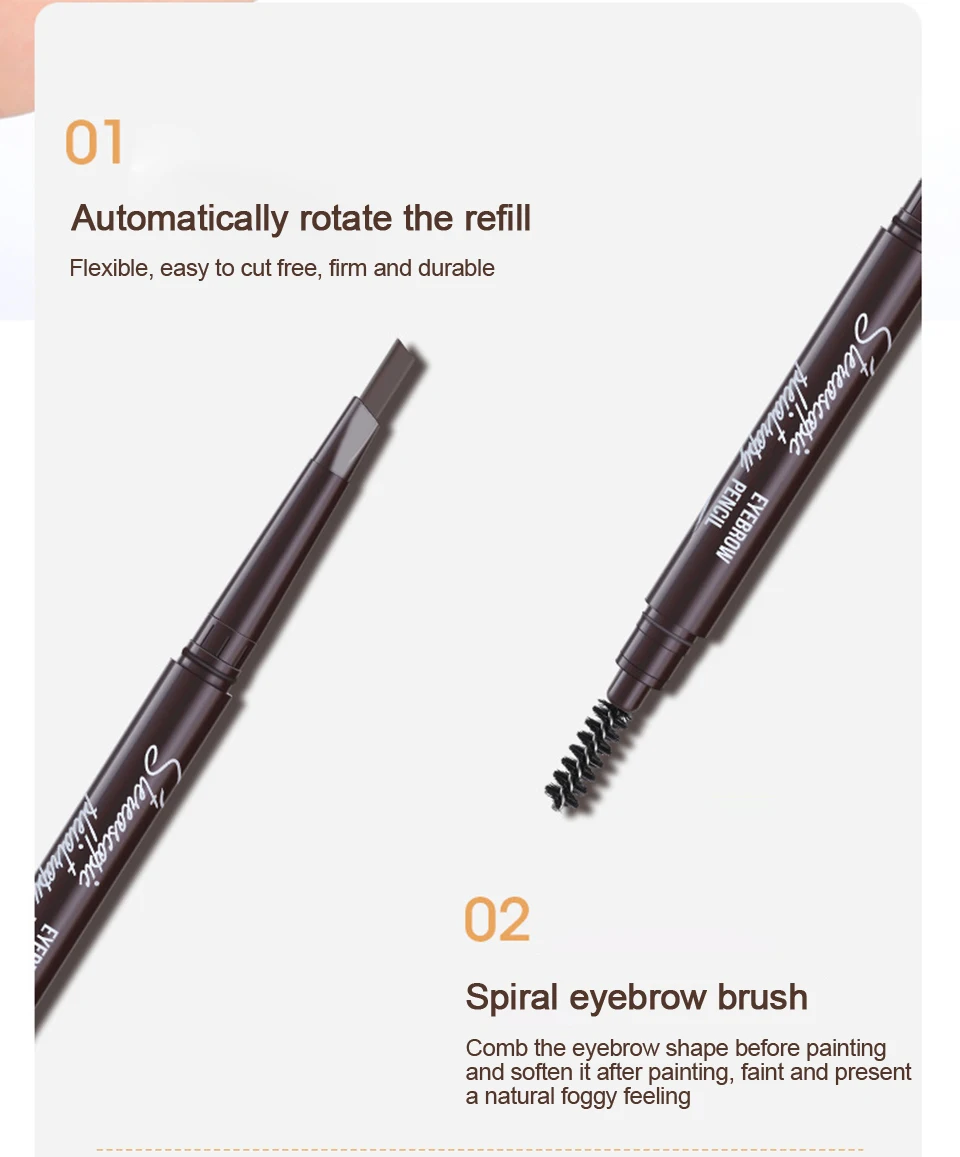 Наполнитель изготовлен из натуральных растительных масел. Наполнитель мягкий и имеет четкий контур, яркий цвет и более сильный трехмерный эффект. Двухголовый дизайн, один-Вращающаяся заправка, а другой-Спиральная кисть для бровей. Это двойного назначения в одном такте. Он заботится о каждой брови, расчески перед макияжем и изменяет форму бровей после макияжа, делая ее более трехмерной и натуральной.Особенности: