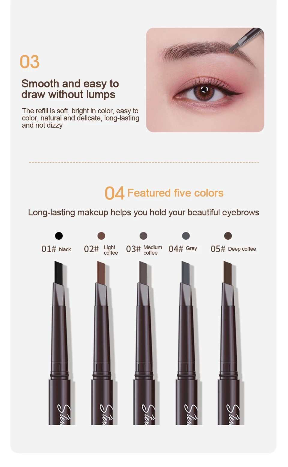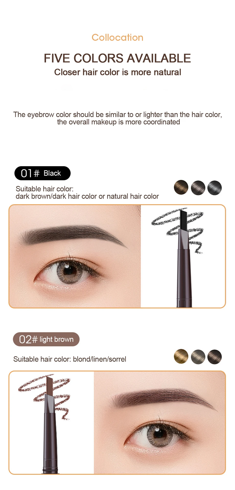 1. Автоматически поворачивает заправку, свободно растягивается, прочный и долговечный. 2. Он гладкий и легко окрашивается без агломерации, легко наносится макияж. 3. Маленький треугольный наконечник ручки с тонкими штрихами, которые могут рисовать красивые брови. 4. Доступно в 5 цветах, ближе к цвету волос более естественным.Упаковочный лист: