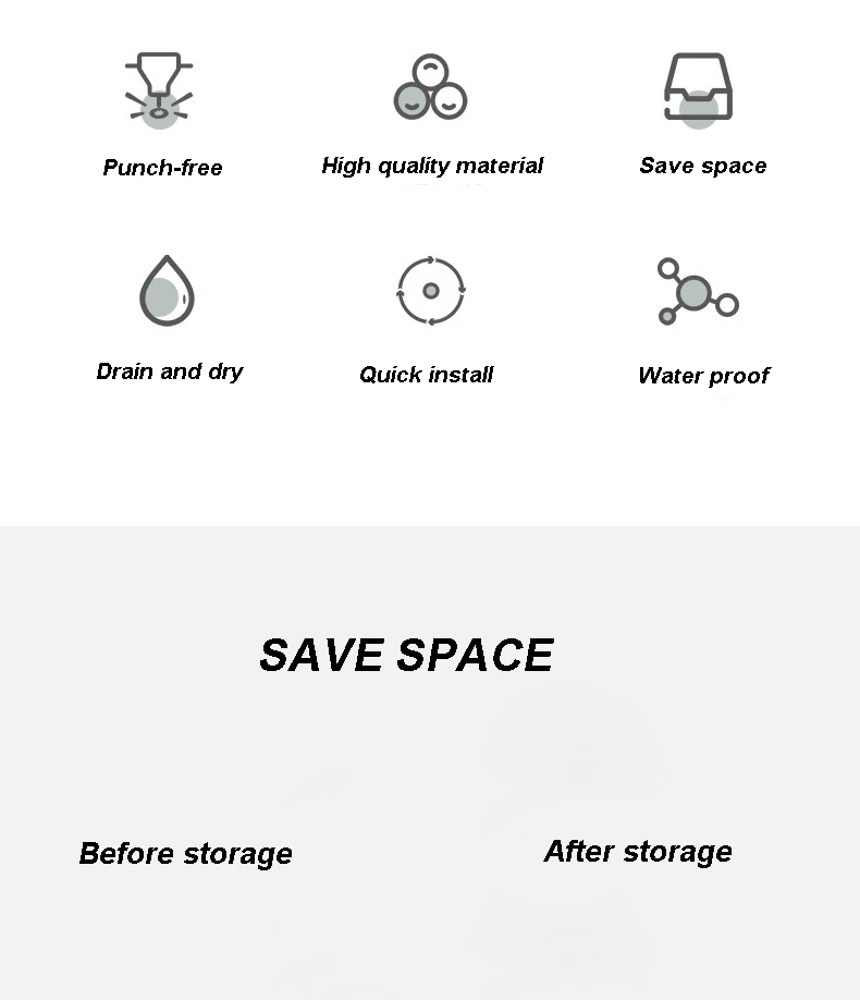 Особенности:Контейнер для хранения изготовлен из АБС-пластика и полипропиленового материала, который является прочным и прочным, дышащим и влагостойким, без перфорации, повышенной несущей способности и не повреждает стену.