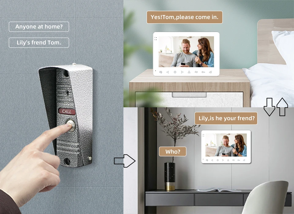 Вы можете не только вести видеодомофон с гостями, но и легко общаться между комнатными помещениями в разных комнатах и разных этажах, что делает общение проще и удобнее.