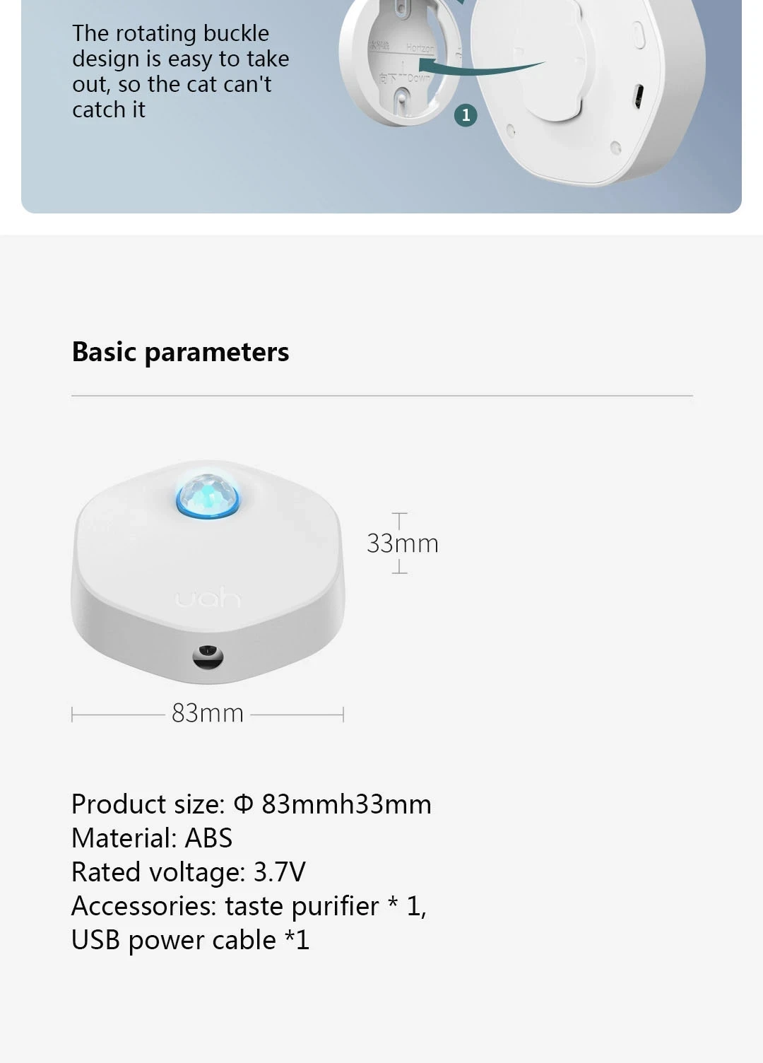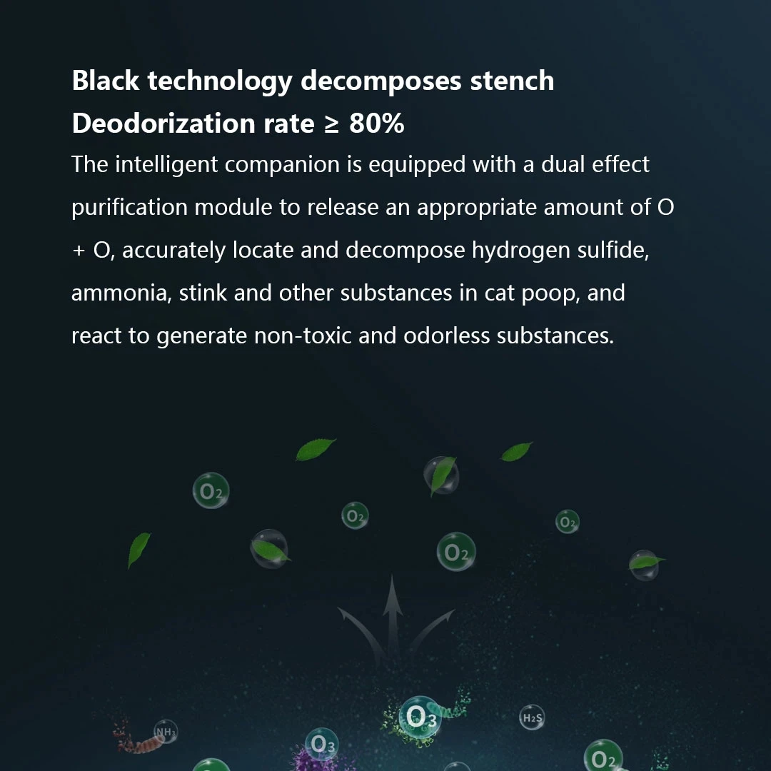 Умный компаньон оснащен модулем очистки с двойным эффектом, который медленно выделяет соответствующее количество активного кислорода + миллион отрицательных ионов. Это занимает всего 5-7 минут, чтобы эффективно разложить запах веществ в Кале кошки и реагирует на производство нетоксичных и без запаха веществ.