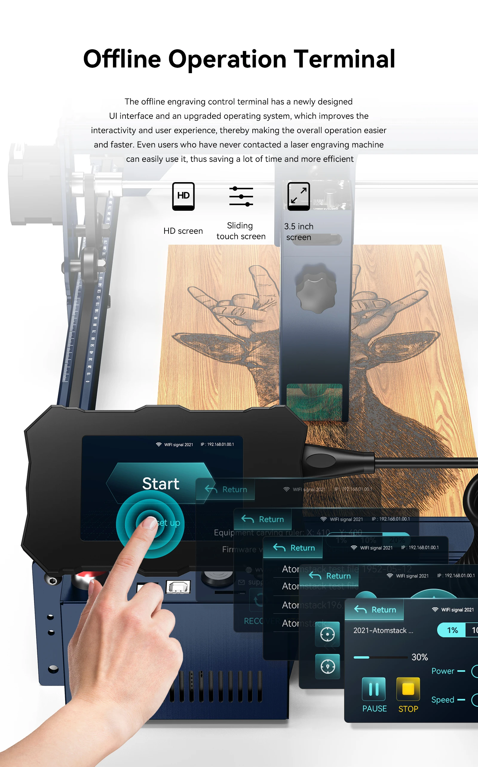 A10 PRO настраивает терминальную панель управления 32 бит, поддерживает автономную гравировку, вы можете выполнять гравировальную работу в любое время и в любом месте, не ограничиваясь компьютером.