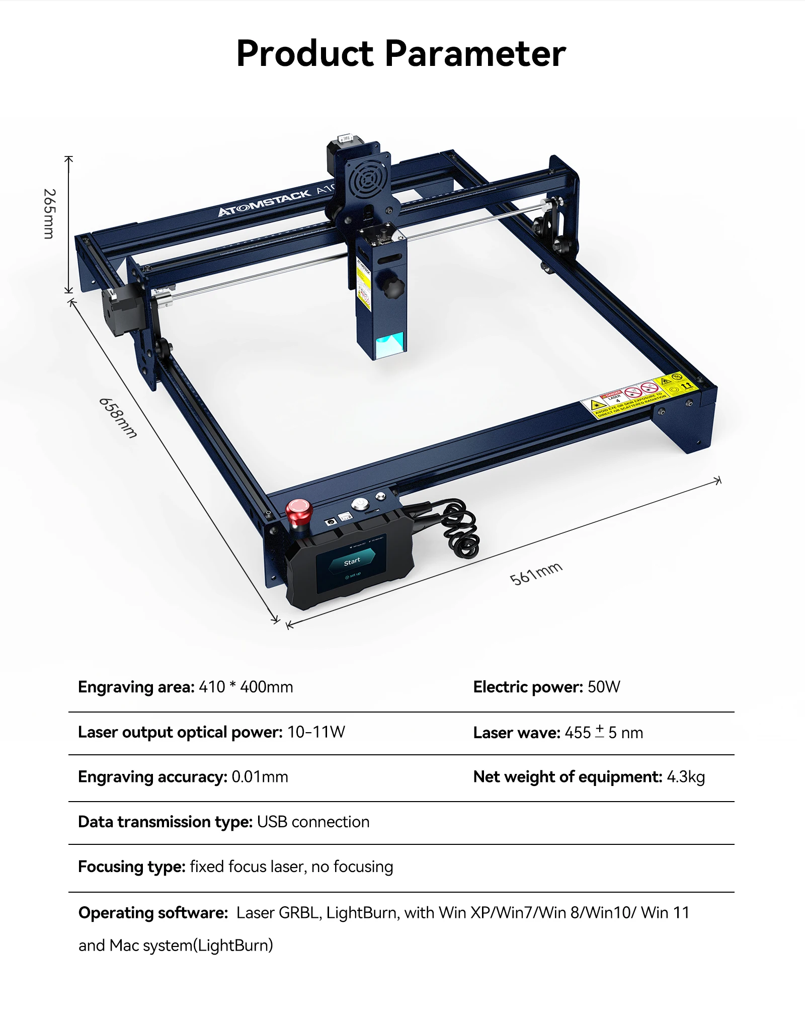Машина может быть совместима с различными зрелыми гравировальными программами, такими как LaserGRBL, LightBurn, поддержка Win XP / Win 7 / Win 8 / XP / Win 10, а также поддержка MAc system (LightBurn), формат гравировки файлов поддерживает NC, BMP, JPG, PNG, DXF и т. Д.