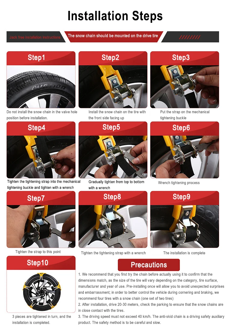The snow chains is easy to install, easy to carry and use for any emergency road assistance. The snow chain can be fitted in minutes, without the jack or move the car. One tire is equipped with three snow chains, and another snowchain is used for replacement