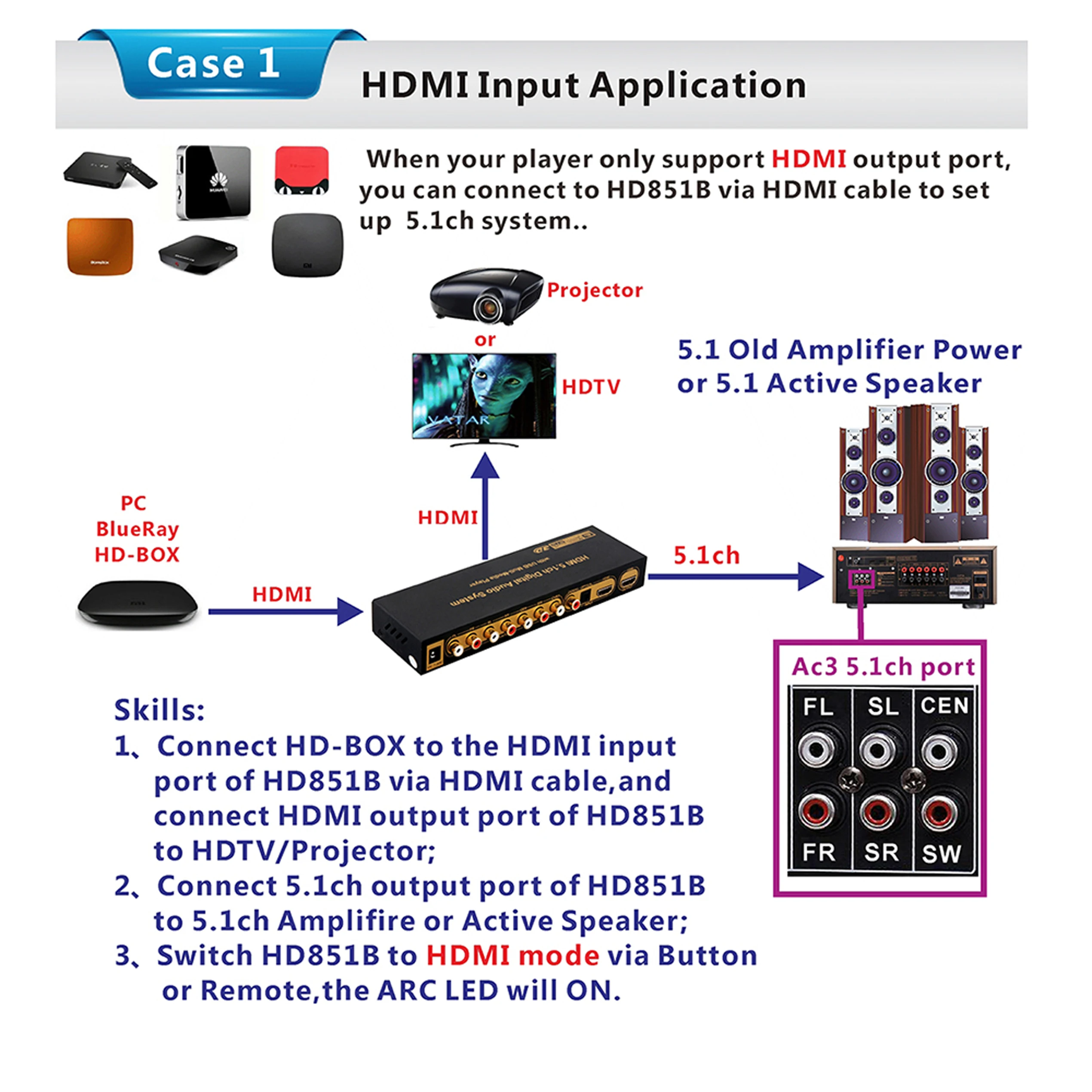 1: поддерживает один вход HDMI, один коаксиальный вход, один оптический вход, один вход PC-USB, один вход AUX, один вход USB 2,0. Вы можете переключать различные источники сигнала в случайном порядке с помощью кнопки или пульта ДУ.