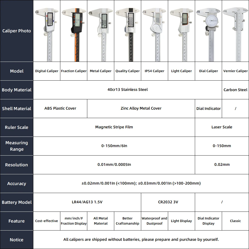 2. Штангенциркули поставляются без батарей, пожалуйста, приобретайте их самостоятельно.