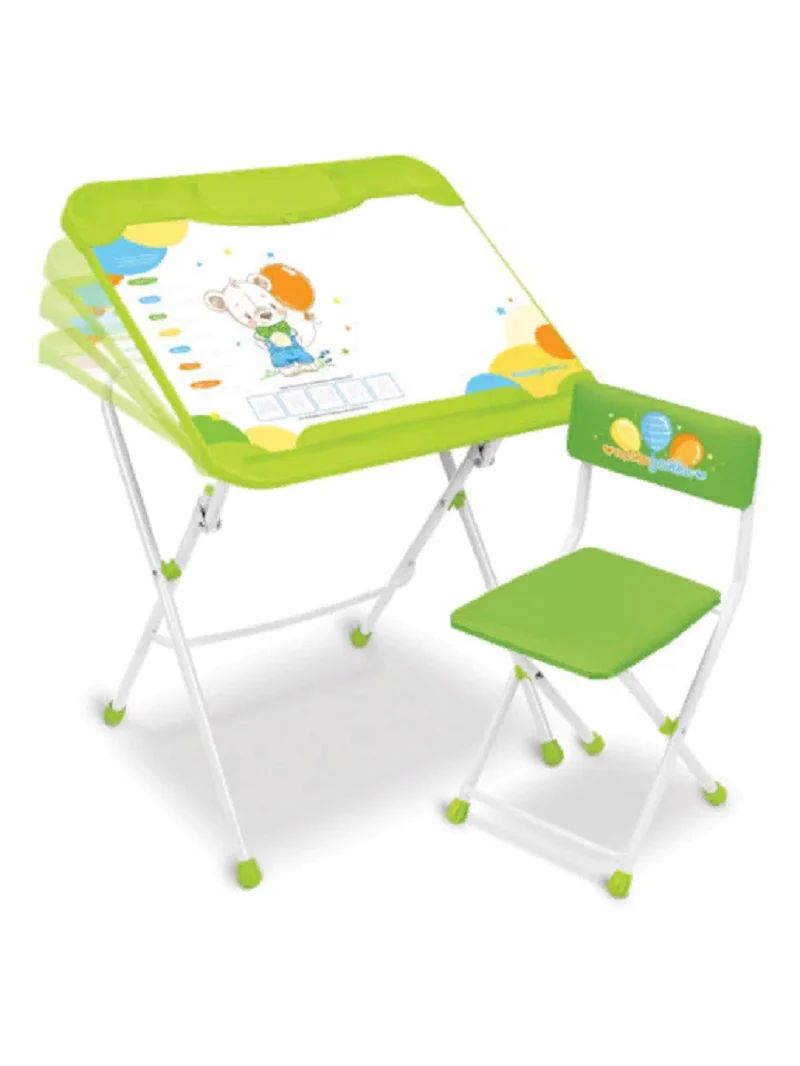 Комплект детской мебели Ника С медвежонком КНД5 - 3в1: стол + парта + мольберт. На столе можно рисовать маркером на водной основе. Преимущества: трансформируемый складной стол-парта с ярким тематическим, рисунком и магнитной поверхностью, магнитная мозаика и азбука, двухсторонний пенал-органайзер для размещения канцтоваров, стакан-непроливайка в наборе, подставка для ног. Поверхность стула: ткань с водоотталкивающей пропиткой.