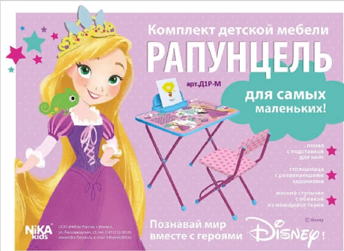 Set of children's folding furniture with cartoon characters Rapunzel Disney set: Table and Chair colorful table top with cartoon characters and cheerful cognitive tasks. The kit will be an excellent solution for the development of a creative workplace of the child, and the training will turn into an exciting game. Can be used for games and dining area for baby. The base is a stable metal frame, the corners of the table and the chair are gently rounded. Convenient folding mechanism and compact storage. The design of the chair provides a foot support. Set in a beautiful gift box-an ideal gift for the baby! For children between 1,5 and 3 years of age. Table top size 60 х45см. The height of the table is 52 cm. The size of the chair seat is 27x31 cm. Height to seat 28 cm. The height of the back of the chair is 53 cm. Chair surface: fabric with water-repellent impregnation. Frame color: Pink. Weight: 6,55 kg
