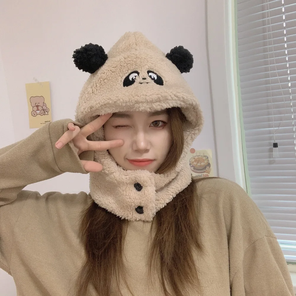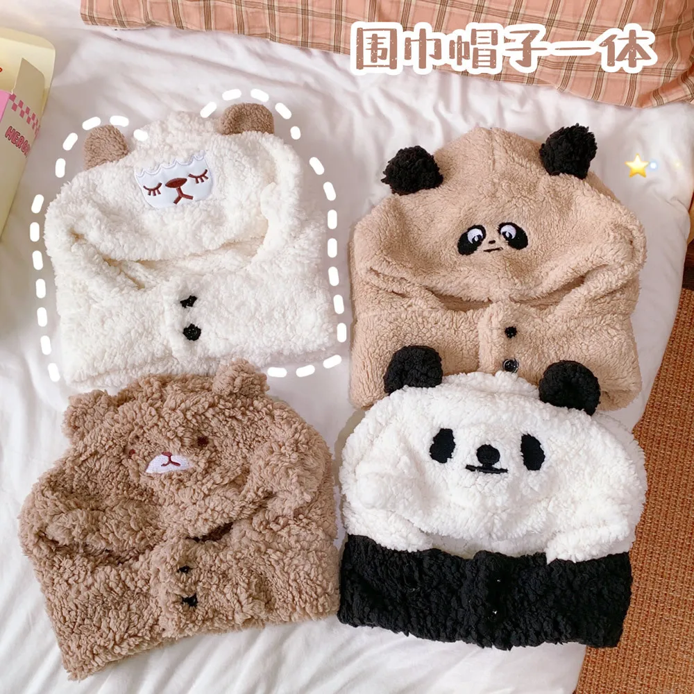 Новые зимние милые плюшевые шапки-шарфики с ушками из овечьей шерсти с рисунком животных, утолщенные теплые шапки с рисунком панды и медведя для женщин и девочек, подарок для детей